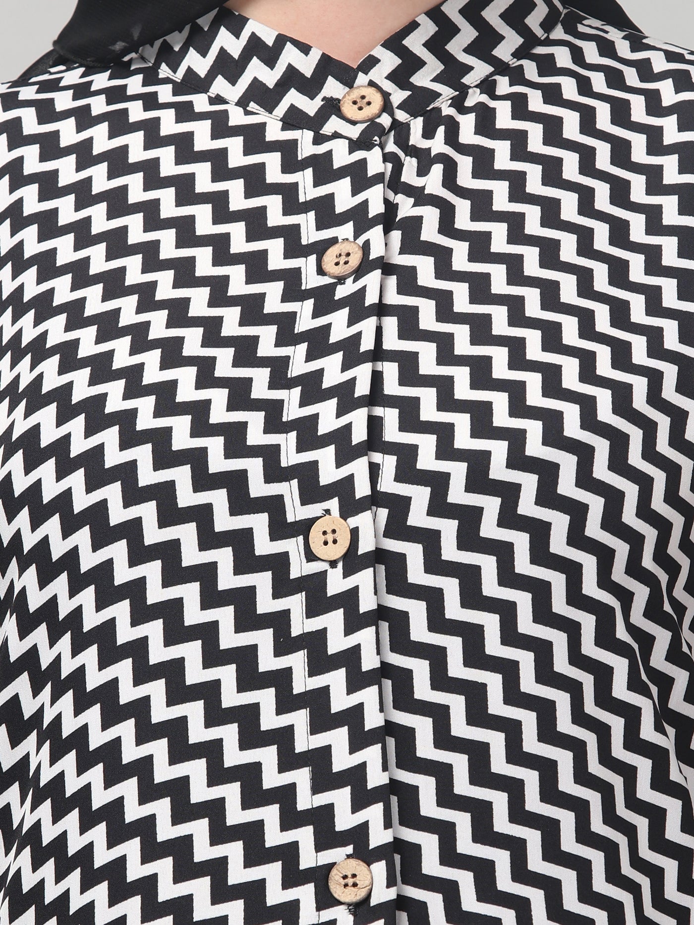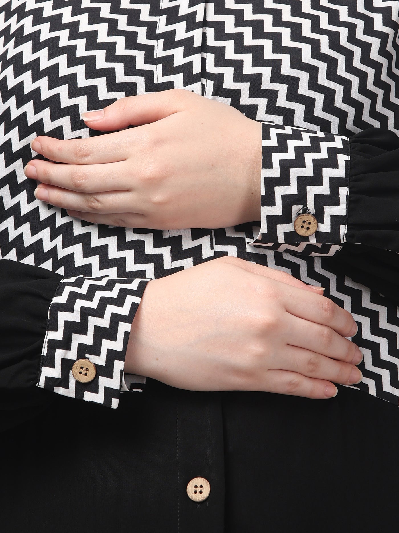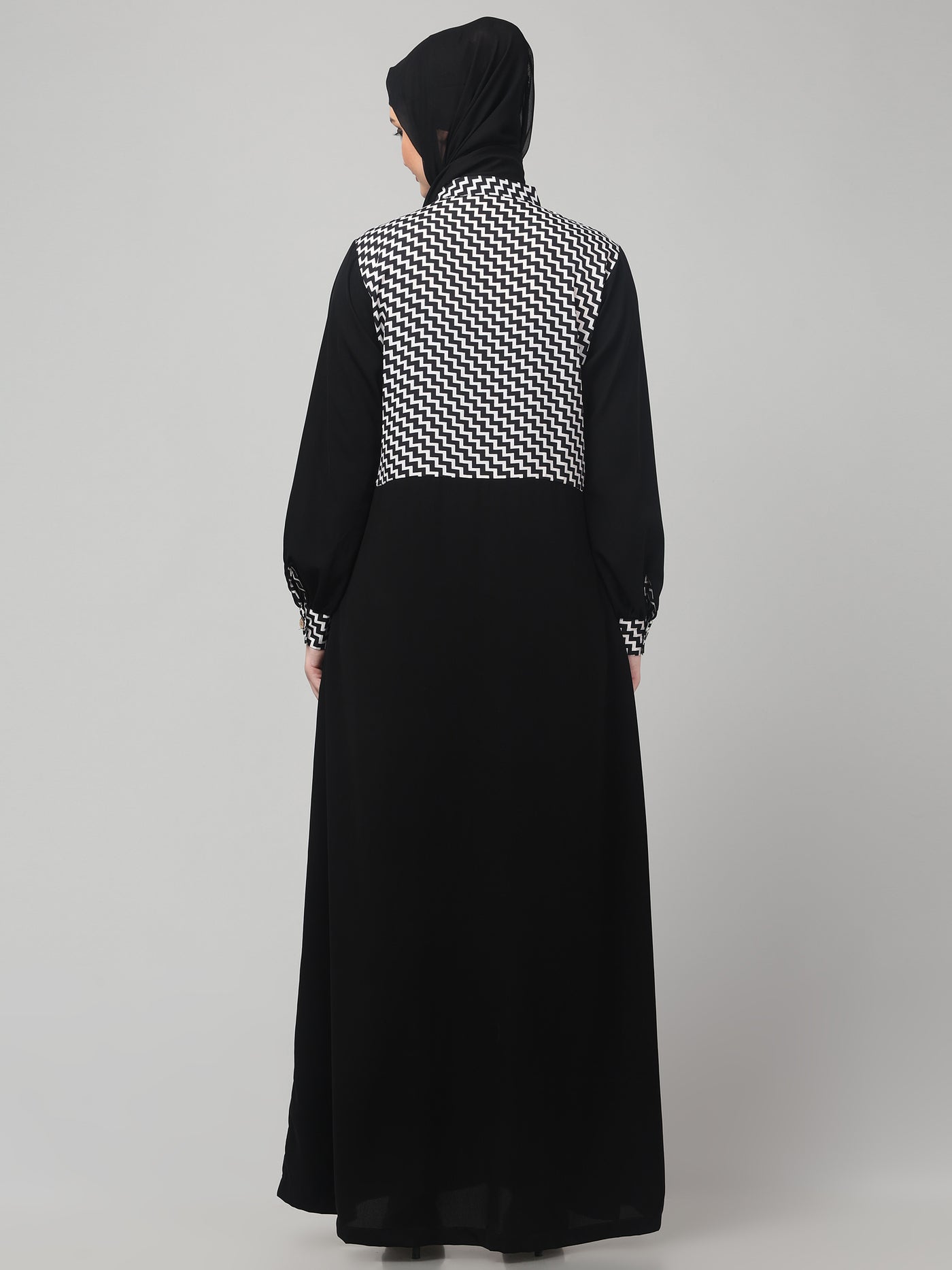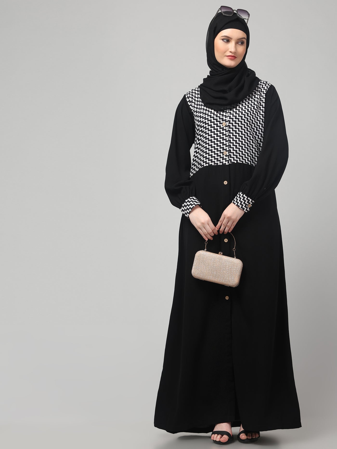 This elegant front open abaya beautifully blends a white zig zag striped crepe upper with a black nida matte lower, creating a graceful and modest look for Muslim women. Designed with a round neck and button closure, it offers both comfort and sophistication. Ideal for Islamic wear, this abaya combines contemporary design with traditional modesty. The dual fabric finish ensures a stylish yet breathable outfit perfect for daily wear or special occasions.