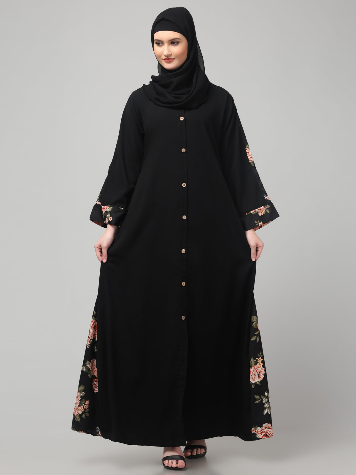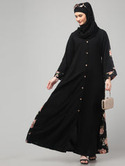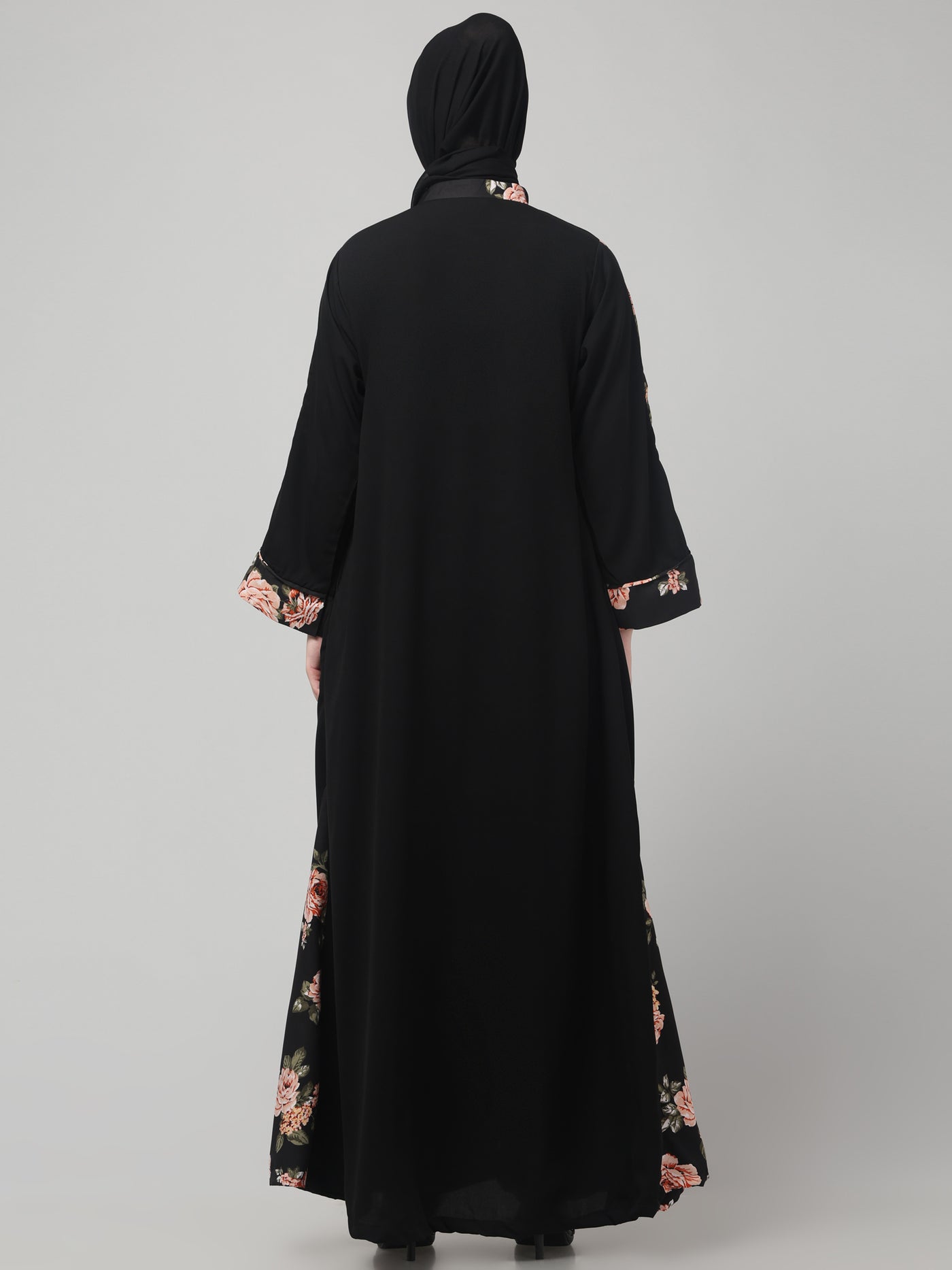 Front-Open Nida Matte Black Abaya with Floral Detailing