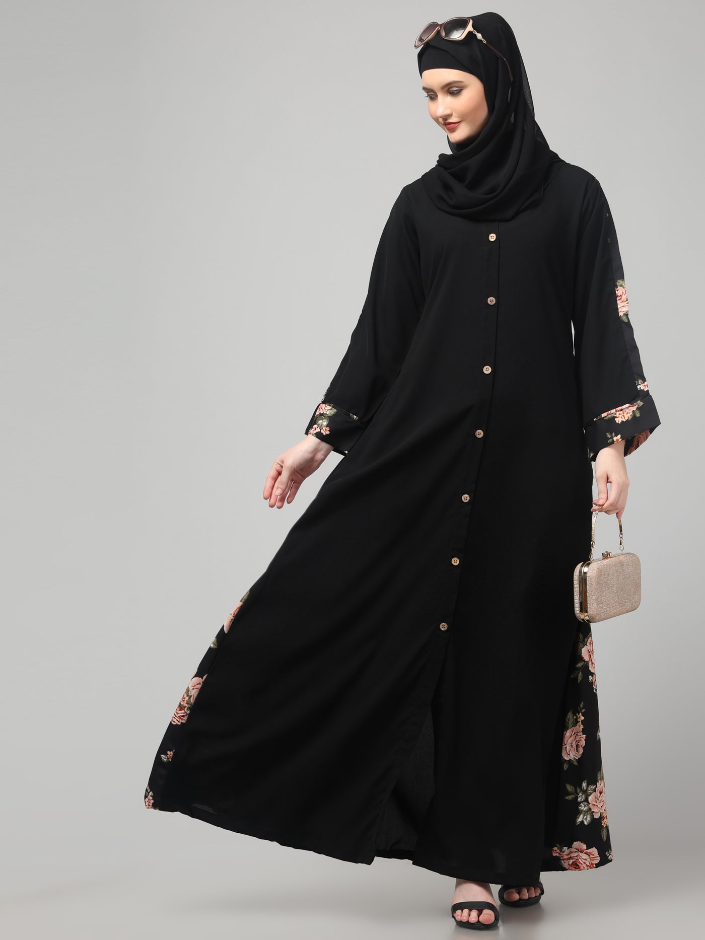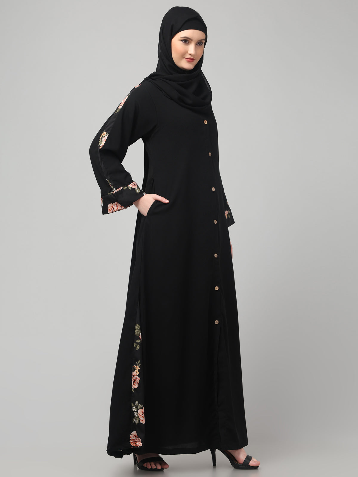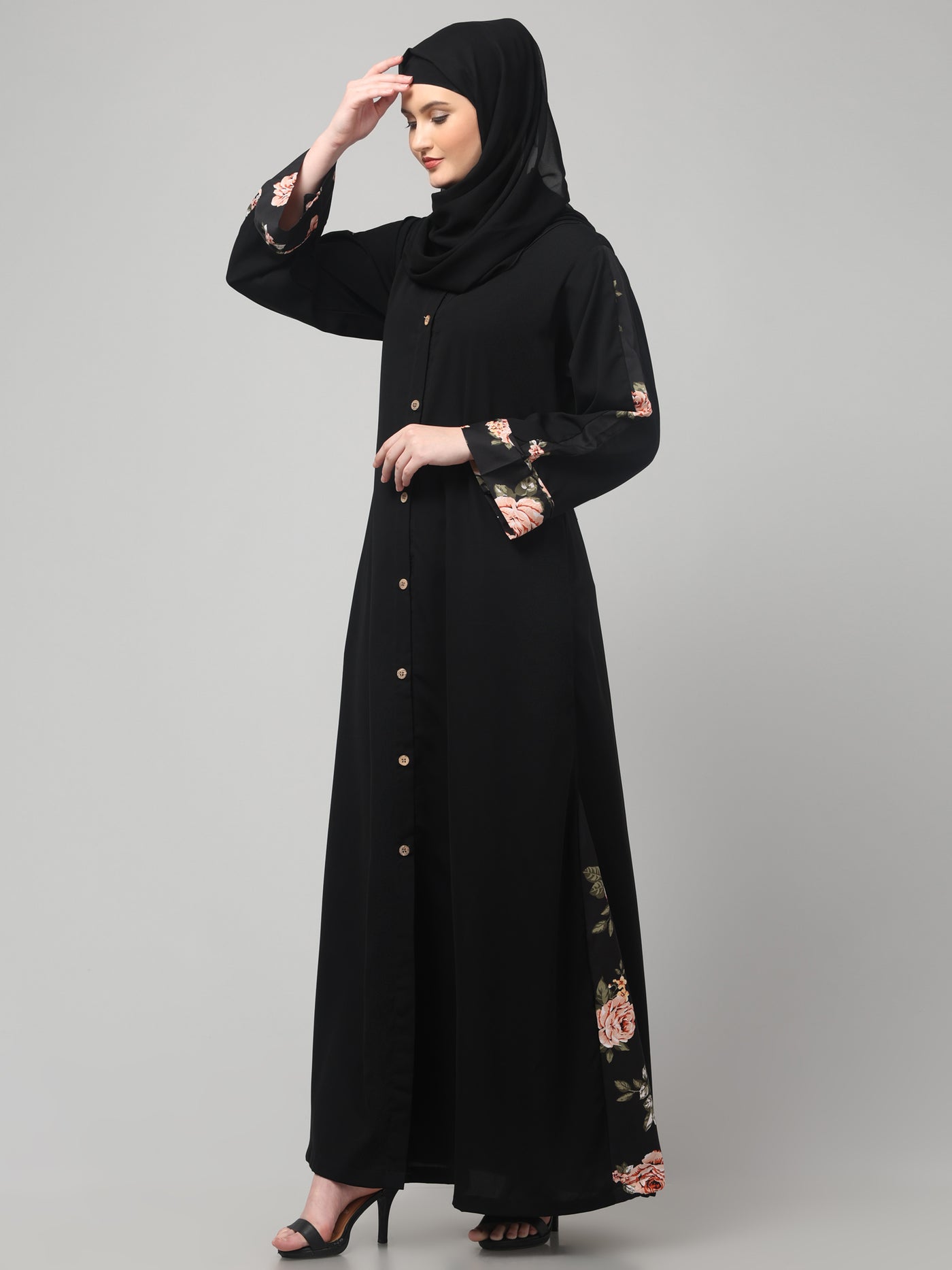 Grace your wardrobe with this elegant black front-open abaya, crafted from premium Nida Matte fabric for a soft, flowy finish. Designed for modesty and comfort, it features floral detailing on the sides and sleeves, adding a touch of sophistication. Perfect for everyday wear, prayers, Eid, or special occasions, this modest abaya beautifully blends style and Islamic tradition. Comes with a matching hijab for a complete and graceful look.