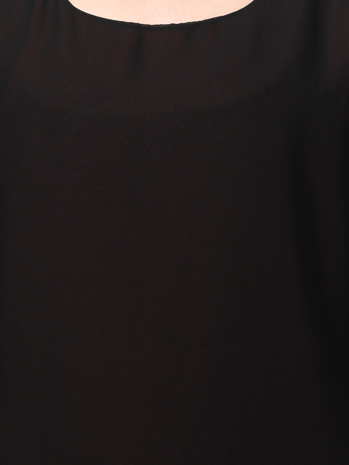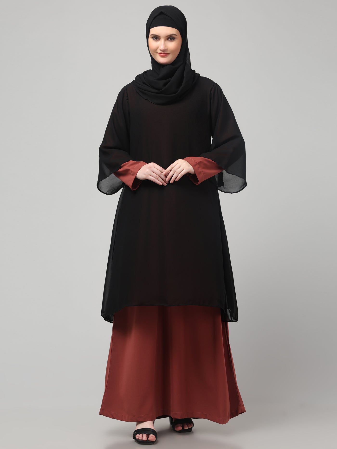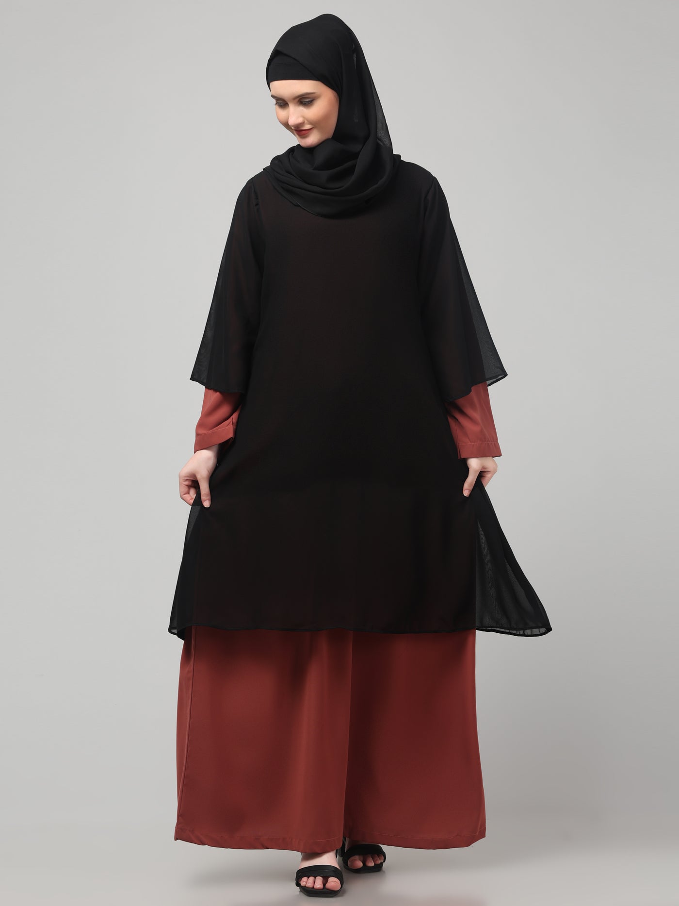 Step into elegance with this black and maroon attached shrug, designed for modest yet fashionable wear. The upper layer features flowy black georgette for a graceful drape, while the maroon inner is crafted from soft nida matte fabric for comfort. With a round neck and slip-on closure, it offers ease without compromising style. Ideal for women and girls who appreciate modesty with a modern twist—perfect for casual outings, gatherings, or modest fashion statements.