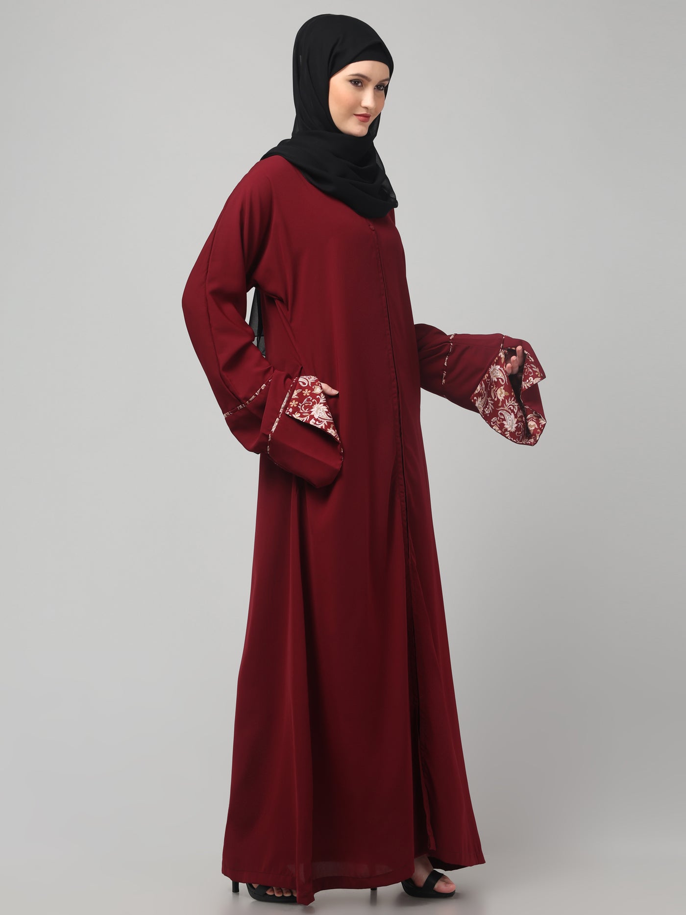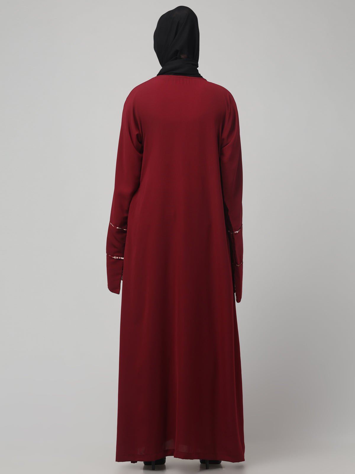 Elegant Maroon Abaya with Embroidered Bell Sleeves